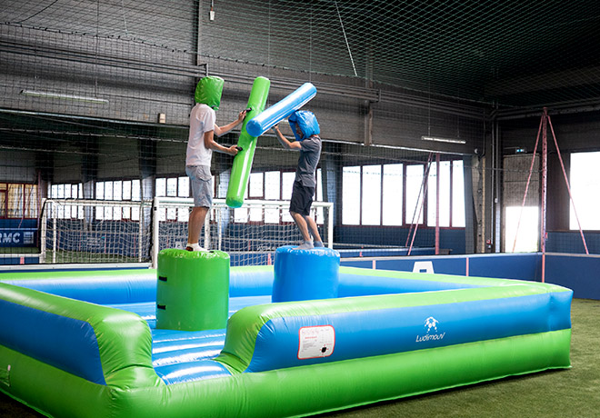 Duel d’équilibre spectaculaire : bâtons mousse, chutes sans gravité, rires et suspense, parfait pour créer un temps fort.